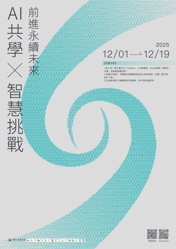 2025-11-10電子資源推廣活動 AI共學 × 智慧挑戰:前進永續未來2025/12/1(一) – 12/19(五) 活動內容 完成以下任務,即可獲得抽獎資格: 進入任一電子書平台(HyRead、udn讀書館、iRead華藝)借閱五本書,並截圖借閱紀錄。點選GIF圖片,隨機前往館藏查詢系統之檢索結果,任選一篇文章進行下載。至活動表單上傳截圖與文章檔案,即可得到抽獎券。 圖片1隨機連結 加碼抽獎 擇一任務完成,再次填寫活動表單,即可多得到一次抽獎券,每人不限加碼次數: 另外借閱五本電子書(需與第一次繳交之五本書不同),並上傳截圖。另選一篇文章進行下載,並上傳檔案。 抽獎獎項 下一則上一則