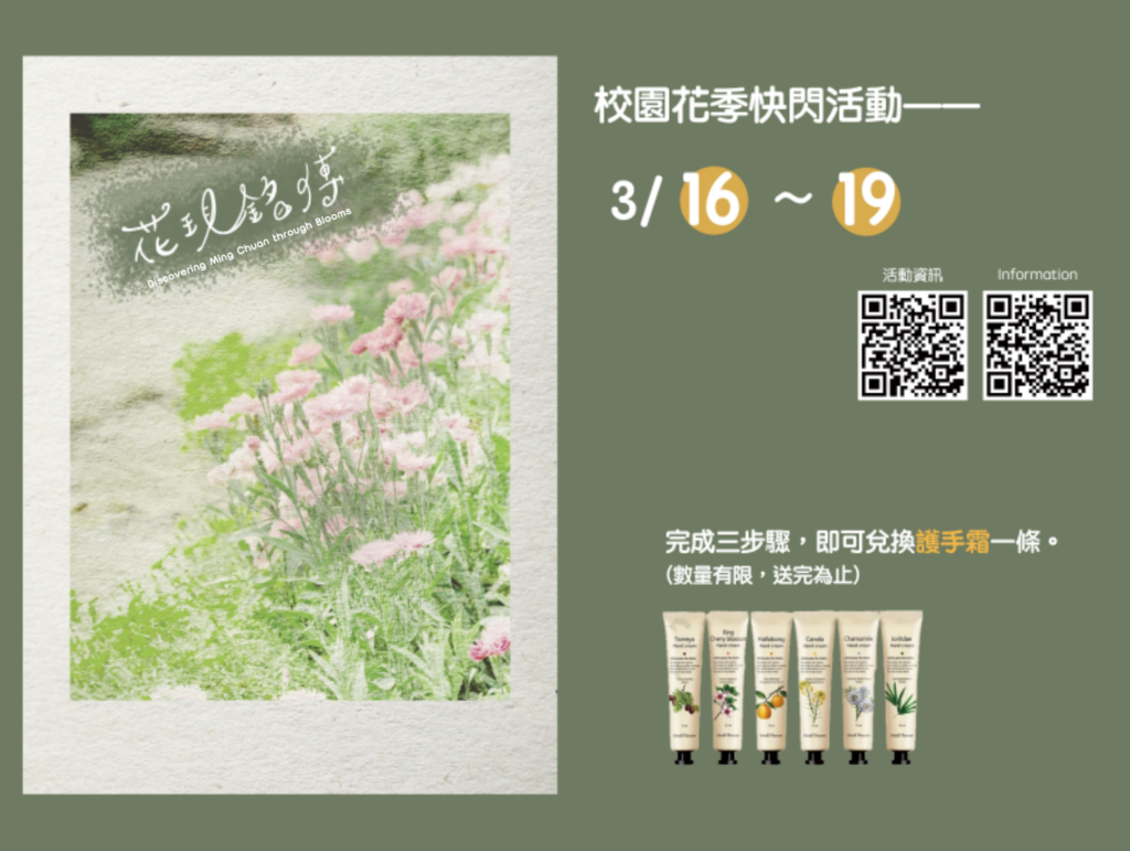 ※校園花卉地圖僅供參考,實際花卉依現場為主。 - 限動打卡:IG/FB限時動態公開分享,並標記#花現銘傳 + @mculibrary +拍攝地點(例如:圖書館前、明園)。