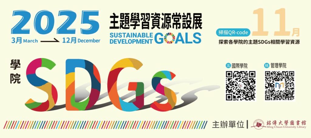 The library will hold a “School SDGs Learning Resources” permanent exhibition on Taipei and Taoyuan campus starting March 2025. This exhibition aims to combine the Sustainable Development Goals (SDGs) of each School with the university’s rich collection of resources, providing faculty and students with diverse thematic learning pathways.