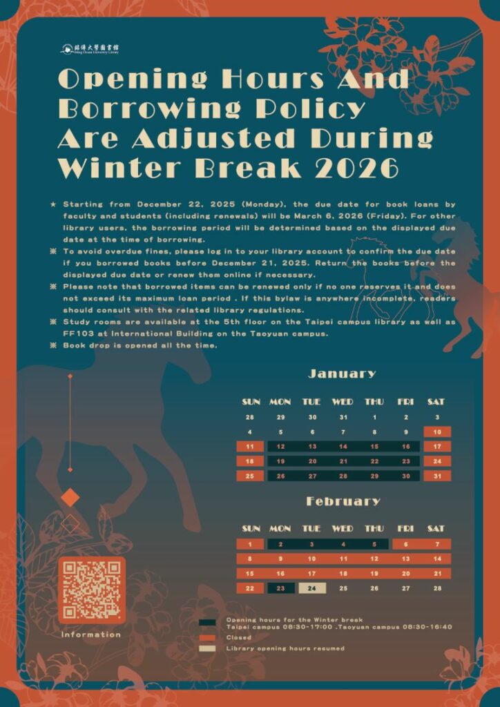 ※ Study rooms are available at the 5th floor (7th Floor of Building E) on the Taipei campus library as well as FF103 at International Building on the Taoyuan campus.